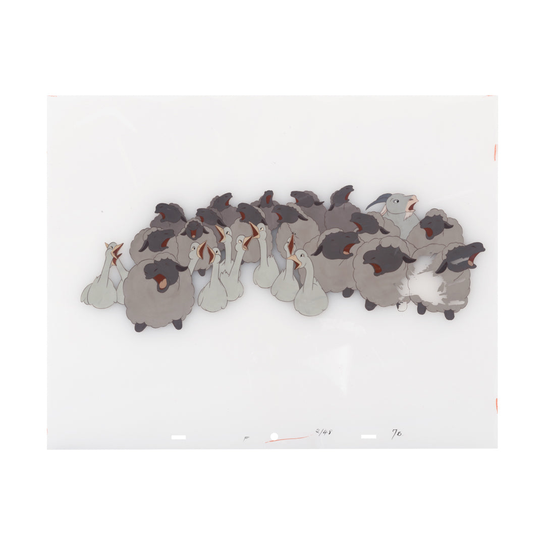 Animation cels and drawings were working artworks with wear and irregularities consistent with studio use and production process. Each piece therefore includes an authentic patina which may include scuffing, tape or tape residue, handling marks, or margin notes. Some yellowing, creases and foxing to the paper and waviness to the cels is common with works of this age. As visible in the image, there are scattered paint losses, mainly limited to the bodies of two sheep.