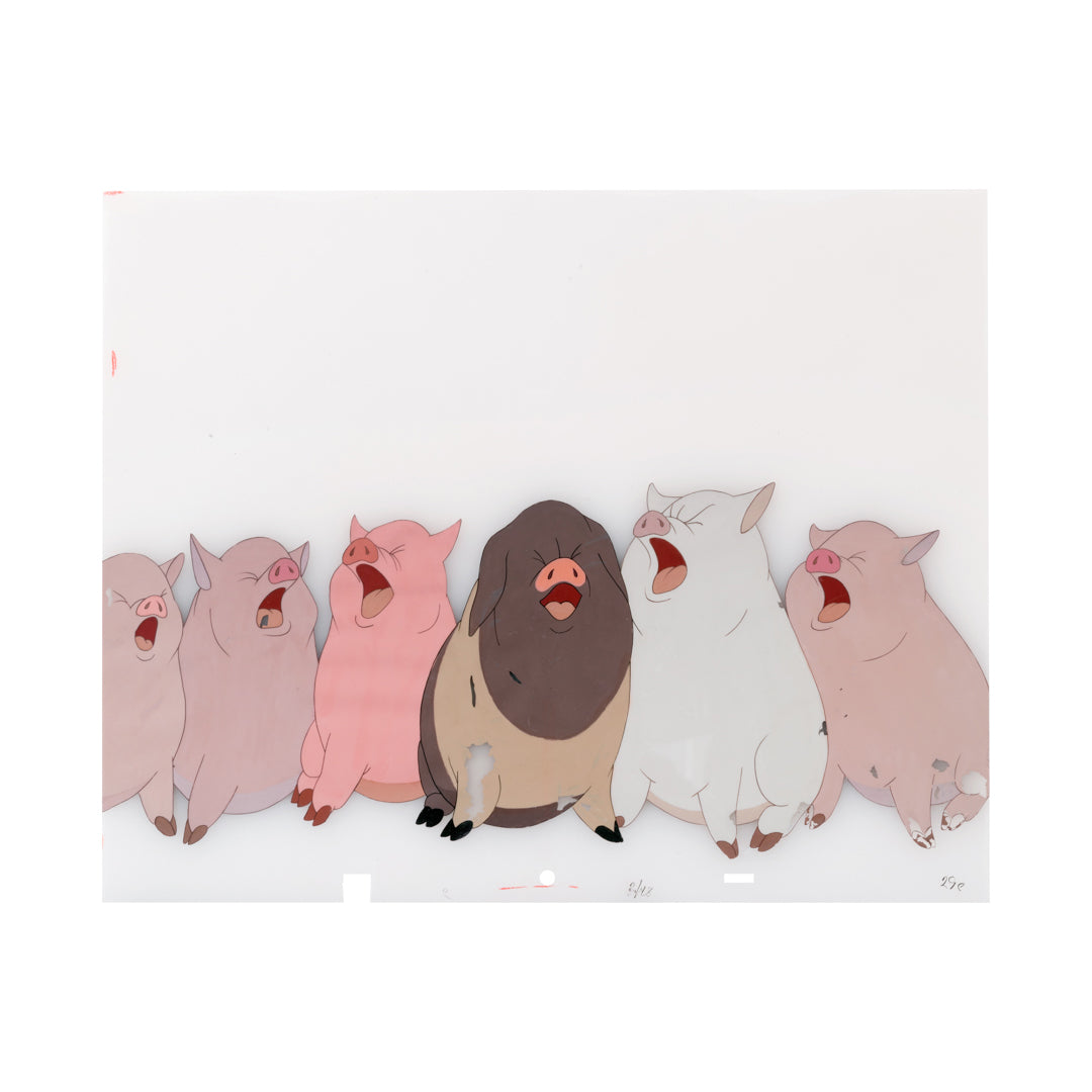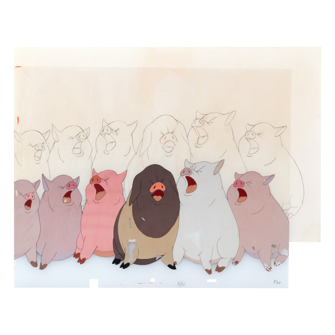 Animation cels and drawings were working artworks with wear and irregularities consistent with studio use and production process. Each piece therefore includes an authentic patina which may include scuffing, tape or tape residue, handling marks, or margin notes. Some yellowing, creases and foxing to the paper and waviness to the cels is common with works of this age. There is a small loss to the left edge. As visible in the image, there is some paint loss to the bodies of the animals. Small restoration to the bottom left corner of the paper, and a small restored rip to the lower left side.