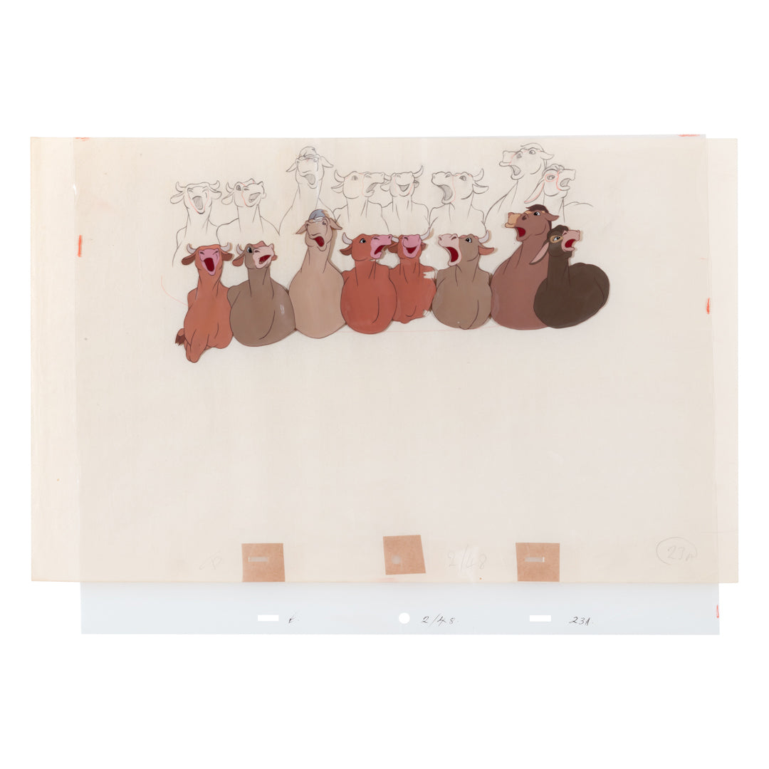 Animation cels and drawings were working artworks with wear and irregularities consistent with studio use and production process. Each piece therefore includes an authentic patina which may include scuffing, tape or tape residue, handling marks, or margin notes. Some yellowing, creases and foxing to the paper and waviness to the cels is common with works of this age. There is an old crease to the upper left and lower right side of the cel. As visible in the image, there is a slight amount of paint loss, mainly limited to the body of one animal.