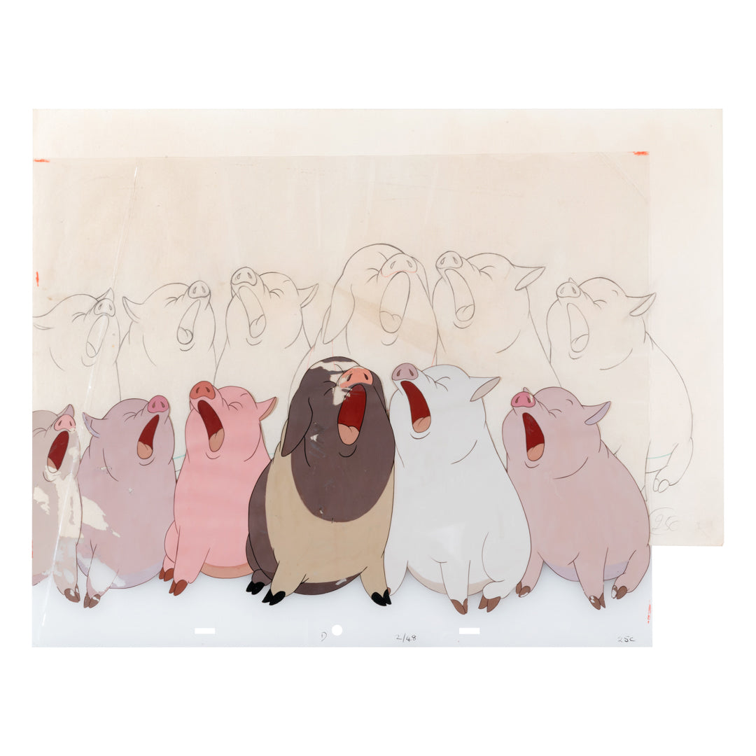 Animation cels and drawings were working artworks with wear and irregularities consistent with studio use and production process. Each piece therefore includes an authentic patina which may include scuffing, tape or tape residue, handling marks, or margin notes. Some yellowing, creases and foxing to the paper and waviness to the cels is common with works of this age. There is an old vertical crease to the left side, and to the upper right corner of the cel. As visible in the image, there is some paint loss, mainly limited to the bodies of three animals, with old discoloration to the center of the paper.