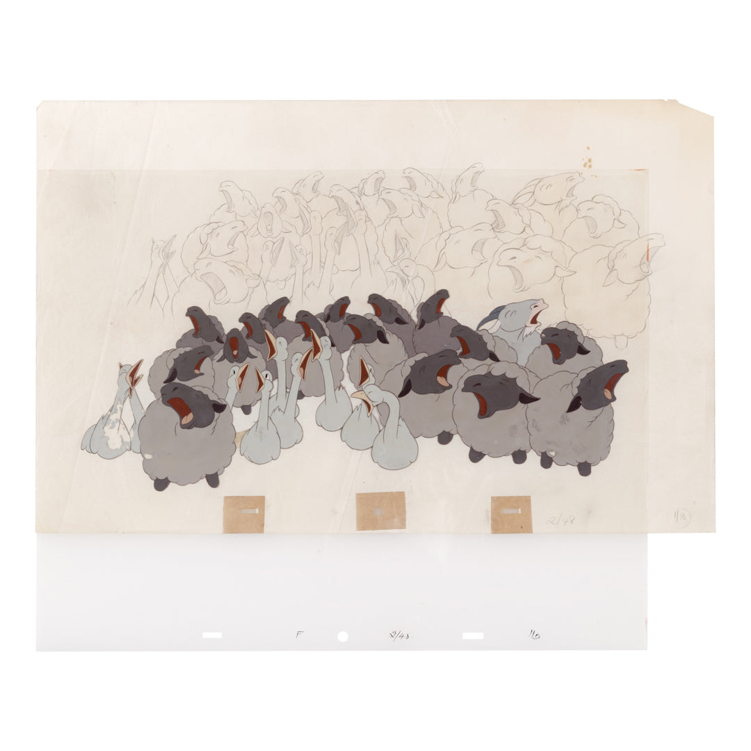 Animation cels and drawings were working artworks with wear and irregularities consistent with studio use and production process. Each piece therefore includes an authentic patina which may include scuffing, tape or tape residue, handling marks, or margin notes. Some yellowing, creases and foxing to the paper and waviness to the cels is common with works of this age. As visible in the image, there is some paint loss, mainly limited to bodies of two geese. The paper has a crease in the middle and two to the left side.