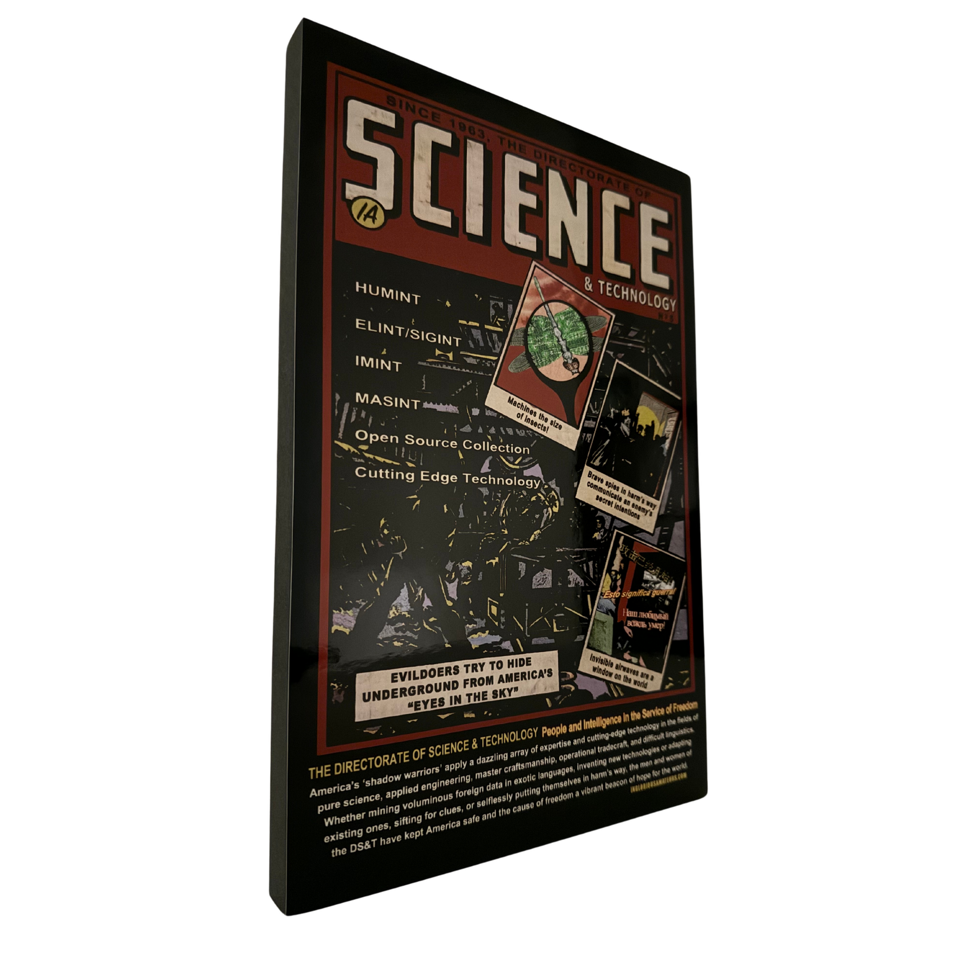 The Office of Technical Services produced several comic book cover prints for its 50th anniversary in 2001, this Directorate of Science and Technology comic being one of them. Originally inspired by the old Spy Hunters comic books from the 1950s, it depicts several scenes of DST officers conducting technical operations and some of the unique technology created but the Directorate.