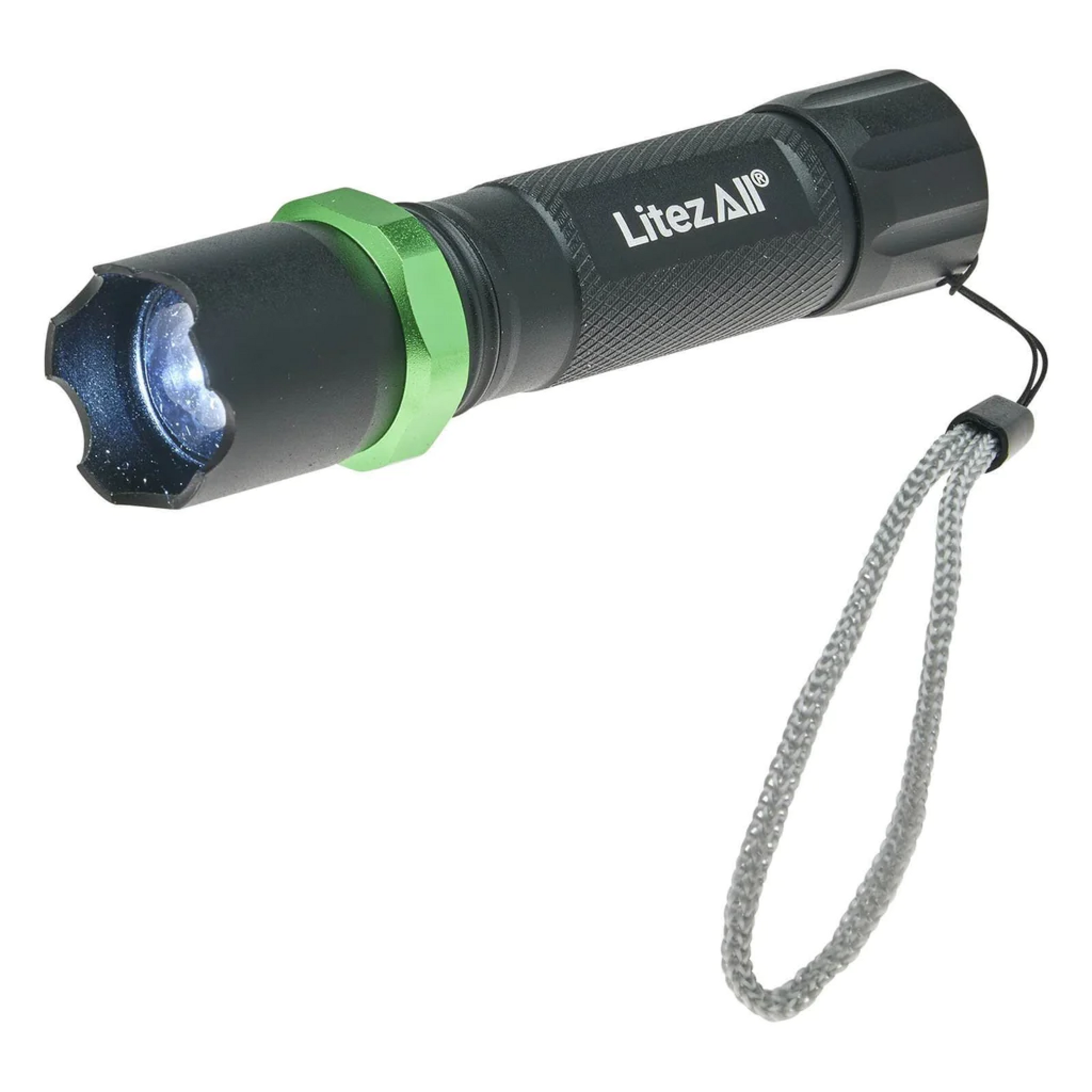 Small but mighty, the LitezAll Rechargeable Mini Tactical Flashlight packs a punch. Three light modes include high and low brightness, and white strobe. Rated at up to 60 max lumens in the high setting and 25 max lumens on low, you can expect up to 4 hours of continuous light. A push/pull focus beam and lanyard (removable) round out the Details.