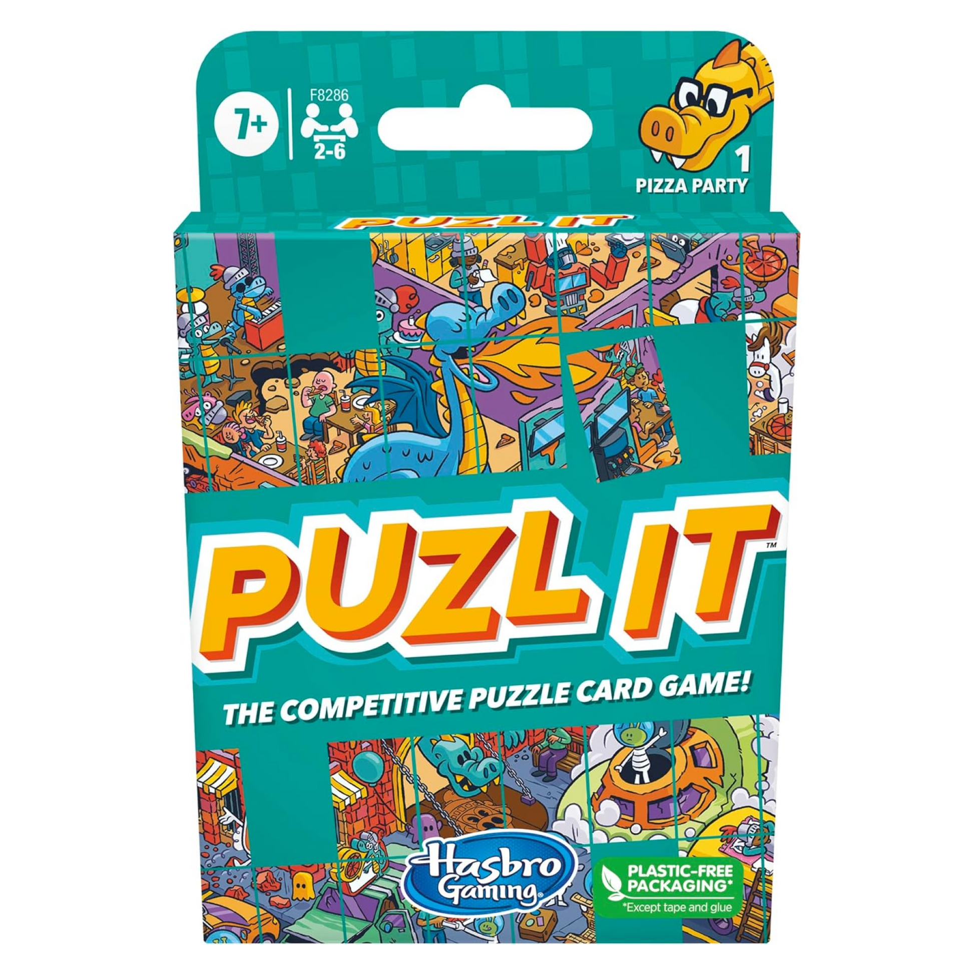 Is it a puzzle? Or is it a card game? It’s … both! The Puzl It game is the competitive puzzle card game for ages 7 and up! In this addictive, easy-to-play game, players lay down cards from their hand to build a puzzle. The more cards they connect in the puzzle, the more cards they can steal from another player’s deck. But if a player gets a Blocker card, their deck is off limits! Be the last one with cards left to win, and then complete the puzzle. With 72 thick, sturdy cards, the Puzl It family card game can be played over and over, so it’s just right for family game night. It even comes with a handy reference poster to show players what the completed image should look like—an eye-popping pizza party scene. Puzl It and all related properties are trademarks of Hasbro.