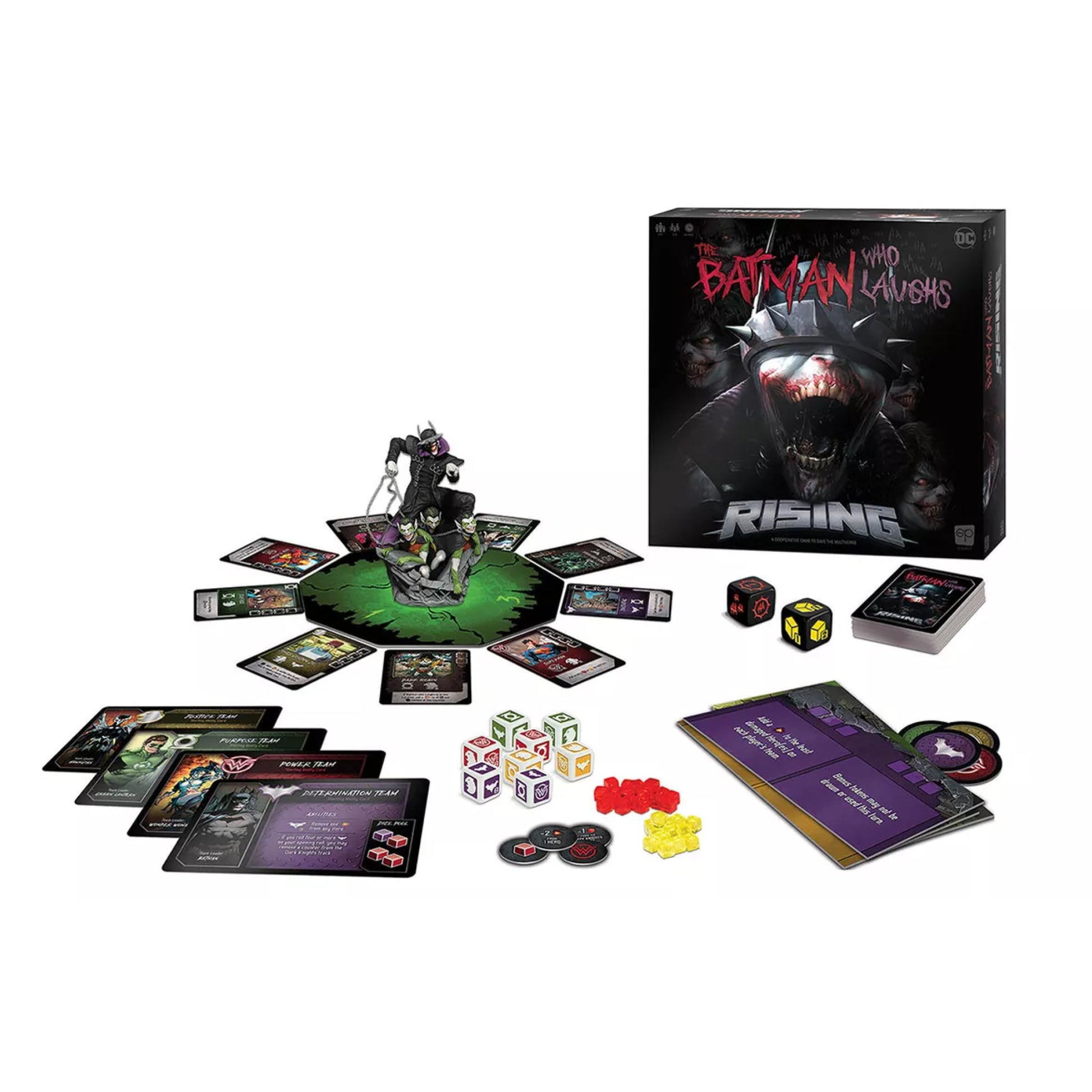 From the Dark Night Metal comic series, the evil hybrid of Batman and Joker, The Batman Who Laughs, is determined to unleash the Dark Knights and Barbatos on Prime. Next in the cooperative Rising series, The Batman Who Laughs Rising, players must work together and roll dice to recruit key heroes and allies to fight back against a host of villains, concluding with a showdown against the Batman Who Laughs. Featuring a one-of-a-kind full color collectible sculpt, it’s the ultimate new Batman board game experience.